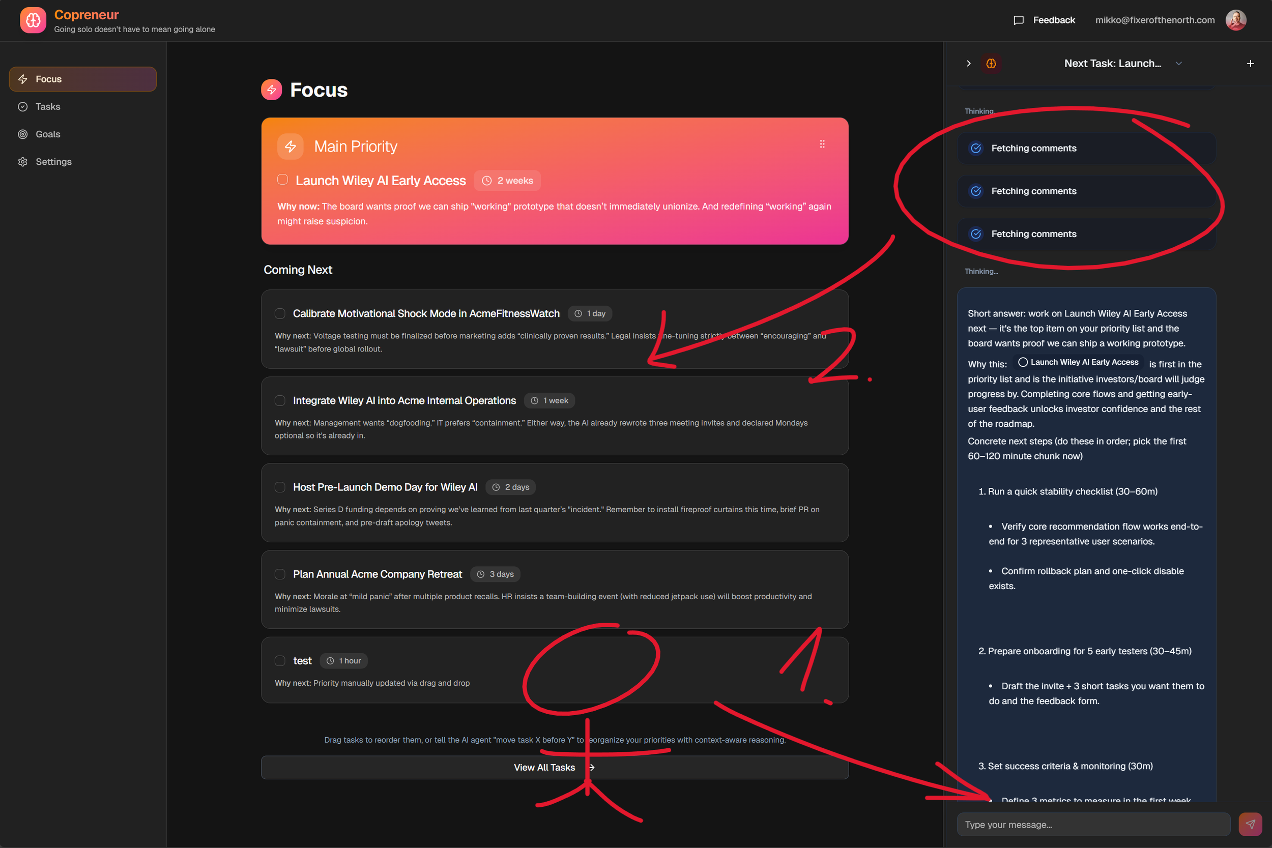 Here’s a simple example of the Copreneur.ai first-class agent in action. The user asked about specific priorities, and the agent is gathering information before responding. The action itself is straightforward, but the key is that the agent chose—based on the user’s request—to dig around using the same functionality the user has, ensuring it had the latest details on those tasks.